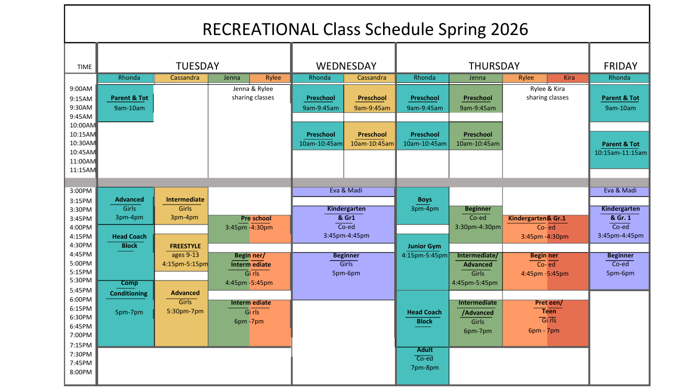 Spring Break Camp: classes will run from March 16 to 20, from 9:00 AM to 1:00 PM. Recreational gymnasts will attend on Monday, Wednesday, and Thursday, while competitive athletes will attend on Tuesday and Friday.